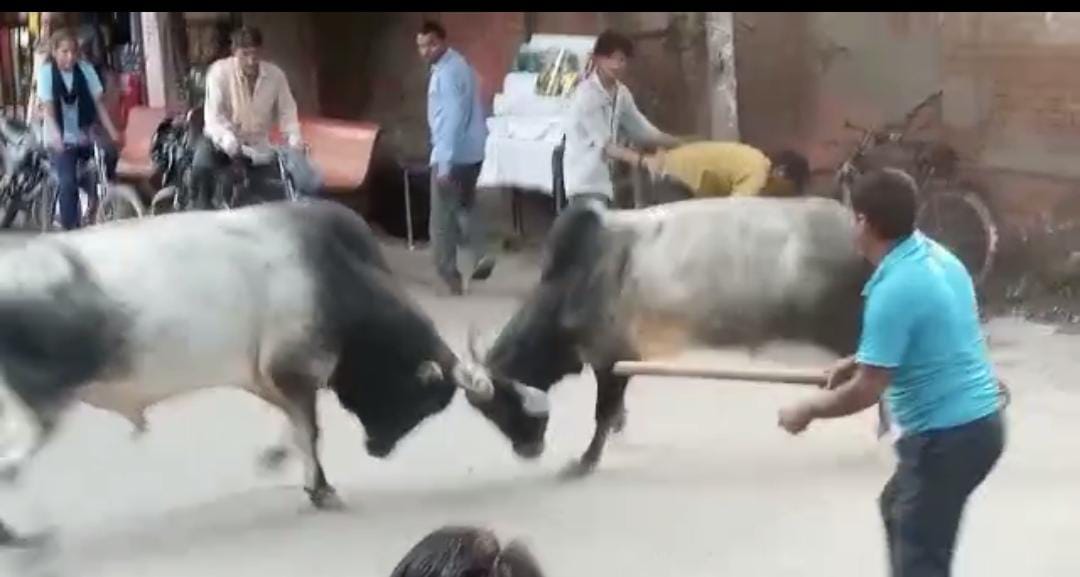 सदर बाजार में छुट्टा सांड लड़े दुकानदार दुकानों में दुबके