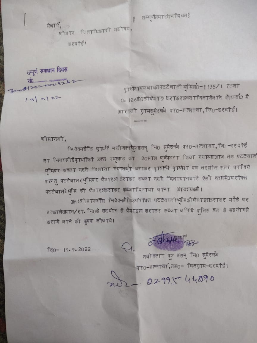 बिलग्राम हरदोई। । जनसमस्याओं के त्वरित निस्तारण एंव सरकारी महकमों की कार्यशैली ठीक कराने के उद्देश्य से समाधान दिवस का आयोजन किया जाता है। किंतु तहसील समाधान दिवस में आम जनता द्वारा दी गई शिकायतों को ही गायब कर दिया जाता है। और कम शिकायत आईं दिखा कर खूब वाह वाही लूटी जाती है। परिणाम स्वरूप जनता उच्च अधिकारियों के पास चक्कर काटने के बाद जब काम नहीं होता है तो घर बैठने को विवश हो जाता है। ताज़ा मामला बिलग्राम तहसील का सामने आया है यहां पर पिछली 19 सितंबर को संपूर्ण समाधान दिवस का आयोजन किया गया था जिसमें जिलाधिकारी महोदय को पहुंचना था लेकिन किसी कारणवश वो समाधान दिवस में नहीं पहुंच पाये, उनके अलावा जिले के तमाम उच्चाधिकारियों ने शिरकत की इसी समाधान दिवस में अपनी पट्टे की जमीन पर कब्जा दिलाये जाने के लिए नबी बख्श भी शिकायती पत्र लेकर 1:30 मिनट पर वहां पहुंचे लेकिन गेट पर मौजूद मिश्रीलाल ने ये कह कर उन्हें वापस जाने के लिए कह दिया की पावती रसीद बुक खत्म हो गयी हैं। अगली बार आना, जब प्रार्थी ने मिन्नतें की तो मोहर लगा कर बाकायदा शिकायत संख्या डाली और उसे अधिकारियों को दे आने के लिए कहा उसी दौरान एक पत्रकार महोदय के द्वारा उस शिकायती पत्र की मोबाइल से फोटो खींच ली गई लगभग एक सप्ताह के बाद जब संबंधित विभाग के लेखपाल से उस शिकायत के बारे में पूछा गया तो उन्होंने साफ मना कर दिया कि मेरे पास ऐसी कोई शिकायत नहीं पहुंची तब जाकर इस गोलमाल का पर्दाफाश हुआ सूत्र बताते हैं कि हर समाधान दिवस में रसीद बुक खत्म हो गयी कह कर सैकड़ों शिकायतों को इधर-उधर कर दिया जाता है। या फिर भोले-भाले फरियादियों को घर वापस भेज दिया जाता है। इसी लिए भागदौड़ के बाद भी जब काम नहीं होता तो विवश होकर फरियादी घर बैठ जाता है ऐसा ही नवीबख्श के साथ हुआ है ये अपनी जमीन पाने के लिए पिछले बीस वर्षों से भागदौड़ कर रहे हैं लेकिन भष्ट सिस्टम और लचर प्रणाली के चलते आज भी अपनी जमीन पर हल नहीं चला पाये हैं।