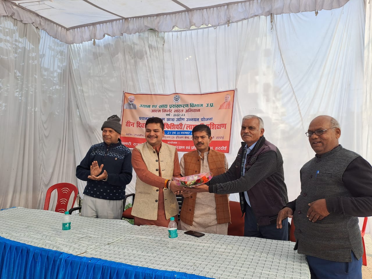हरदोई।प्रभारी राजकीय सामुदायिक फल संरक्षण एवं प्रशिक्षण केन्द्र  राम औतार ने बताया है कि राजकीय फल संरक्षण केन्द्र लक्ष्मी बिहार कालोनी मेें प्रधानमंत्री सूक्ष्म खाद्य उद्योग उन्नयन योजना के अन्तर्गत आयोजित तीन दिवसीय प्रशिक्षण का आयोजन किया गया जिसमें विभिन्न विभागों के व्याख्याताओं ने अपने विचार रखें और इसी कड़ी में आज प्रशिक्षण के अन्तिम दिन सभासद मुनि मिश्रा द्वारा कार्यक्रम का समापन किया। इस अवसर पर उपायुक्त उद्योग सुनील कुमार त्रिपाठी, एलडीएम जेपी सिंह, परवीन कुमार, अनूप श्रीवास्तव, जगरूप् सिंह तथा अजय कुमार आदि उपस्थित रहें।