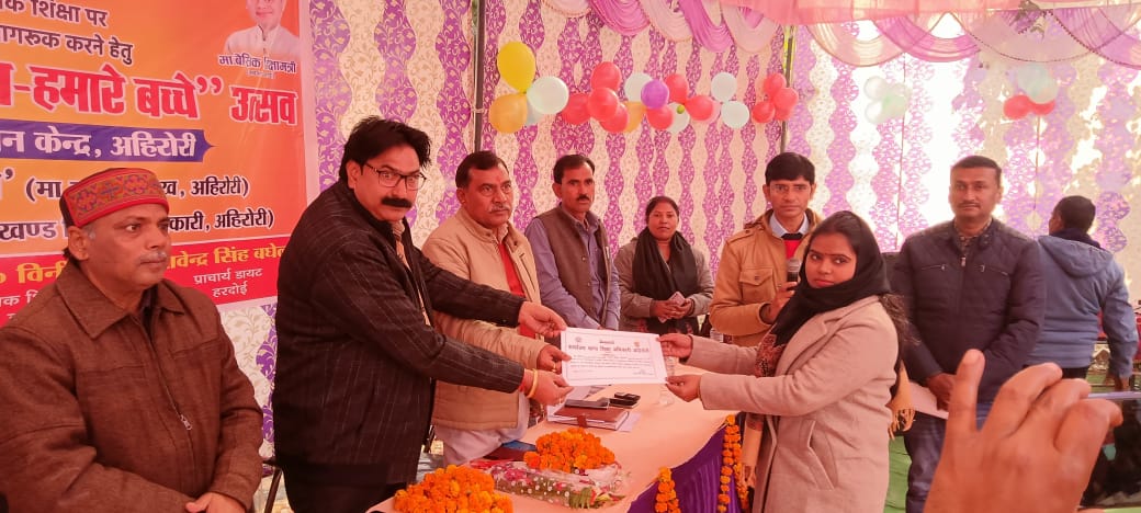 बघौली हरदोई /अहिरोरी में आयोजित हमारा आंगन, हमारे बच्चे उत्सव, कार्यक्रम के शुभारंभ के दौरान बृजेश कुमार मिश्र, खंड विकास अधिकारी अहिरोरी ने कहा किए 3 से 6 वर्ष के अधिक से अधिक बच्चों को पूर्व माध्यमिक शिक्षा से जोड़ने के लिए सभी जिम्मेदारों को अपनी सक्रिय भूमिका निभानी होगी, आंगनबाड़ी कार्यकत्री एवं सहायिका, शिक्षा शिक्षक व विद्यालय प्रबंध समिति के जिम्मेदार इस दिशा में सार्थक पहल करना सुनिश्चित करें, उन्होंने कहा कि छोटे बच्चों को शिक्षित करने की जिम्मेदारी आंगनबाड़ी कार्यकत्रियों व शिक्षकों की है, उतनी ही नामांकन व नियमित उपस्थिति का ध्यान रखने की जिम्मेदारी अभिभावकों की भी है। बच्चों को इस प्रकार शिक्षा दी जाए जिससे कि उनकी मानसिक क्षमता का विकास हो तथा शिक्षा के प्रति उत्साह बना रहे। आंगनबाड़ी केंद्रों व प्राथमिक विद्यालयों में बुनियादी साक्षरता के अंतर्गत कई प्रकार की सुविधाएं दी जा रही है। राष्ट्रीय शिक्षा नीति के अंतर्गत परिषदीय विद्यालयों में बेसिक शिक्षा विभाग और बाल विकास विभाग की ओर से नौनिहालों को शिक्षा से जोड़ने की पहल की जाएगी। अभिभावकों को पूर्व माध्यमिक एवं बुनियादी शिक्षा में उनकी एवं घर की भूमिका से अवगत कराया जाएगा। इस कार्यक्रम में मुख्य अतिथि ब्लॉक प्रमुख धर्मवीर सिंह पन्ने खंड विकास अधिकारी बृजेश कुमार मिश्रा उदय भान जी ए आरती राममूरत विवेक कुमार महेश प्रसाद एवं नोडल संकुल शिक्षक ओम प्रकाश सुनीता सिंह धर्मेंद्र सिंह आशीष कुमार सिंह तथा भारी मात्रा में शिक्षक शिक्षिकाएं भाई बहन अभिभावक आदि लोग उपस्थित रहे