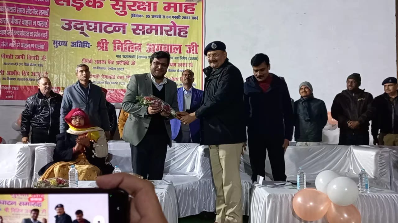 हरदोई,05 जनवरी से 04 फरवरी 2023 तक मनाये जाने वाले सड़क सुरक्षा माह का उद्घाटन आज रसखान प्रेक्षागृह मे मा0 राज्य मंत्री स्वतन्त्र प्रभार नितिन अग्रवाल द्वारा किया गया। मा0 मंत्री द्वारा दीप प्रज्वलित कर कार्यक्रम का उद्घाटन किया। अपने सम्बोधन मे मा0 मंत्री ने कहा कि सड़क दुर्घटना मे होने वाली मौतों की संख्या मे जागरूकता के माध्यम से कमी लायी जा सकती है। पूरे माह के दौरान व्यापक चेकिंग अभियान चलाया जाये तथा यातायात नियमों का पालन करवाया जाये। विभिन्न कार्यक्रमों के माध्यम से लोगों को यातायात नियमों के प्रति जागरूक किया जाये। उन्होंने कहा कि शिक्षक गण विद्यार्थियों को यातायात नियमों के बारे मे बताये तथा विद्यार्थीगण अपने अभिभावकों व आप-पास के अन्य लोगों को यातायात नियमों के पालन के प्रति जागरूक करे। उन्होंने जनपद वासियों से अपील की कि बाईस चलाते समय हेल्मेट अवश्य लगाये। कार चलाते समय सीट बेल्ट का इस्तेमाल करे। शराब पीकर गाड़ी न चलाये तथा वाहन की गति को निर्धारित सीमा मे रखे। विशिष्ट अतिथि मा0 जिला पंचायत अध्यक्ष प्रेमावती ने अपने सम्बोधन मे कहा कि सभी को यातायात नियमों का पालन करना चाहिए तथा वाहन चलाते समय मोबाईल का प्रयोग नही करना चाहिए। जिलाधिकारी मंगला प्रसाद सिंह ने कहा कि सड़क सुरक्षा की स्थिति को बेहतर बनाने के लिए द्वि आयामी रणनीति बनाकर कार्य किया जा रहा है जिसमे एक ओर लोगों को यातायात नियमों के प्रति जागरूक किया जा रहा है वही दूसरी ओर अन्तरविभागीय समन्वय समिति के माध्यम से यातायात अवरोधकों व अन्य समस्याओं को दूर करने तथा प्र्र्रवर्तन की कार्यवाही की जा रही है। मुख्य अतिथि द्वारा उपस्थित लोगों को सड़क सुरक्षा से सम्बन्धित शपथ दिलायी गयी। मुख्य अतिथि मा0 राज्य मंत्री नितिन अग्रवाल, विशिष्ट अतिथि मा0 जिला पंचायत अध्यक्ष प्रेमावती, जिलाधिकारी तथा पुलिस अधीक्षक द्वारा 02 प्रचार वाहनों को हरी झण्डी दिखाकर रवाना किया गया। ये प्रचार वाहन सड़क सुरक्षा माह के दौरान लोगों को यातायात नियमों के प्रति जागरूक करेगें। इस अवसर पर पुलिस अधीक्षक राजेश द्विवेदी, मुख्य चिकित्सा अधिकारी राजेश तिवारी, जिला आबकारी अधिकारी रवि शकंर, एआरटीओं दयाशंकर व विवेक सिंह, जिला विद्यालय निरीक्षक वीके दुबे, पूर्व जिला अध्यक्ष श्री कृष्ण शास्त्री, समाज सेवी प्रियम मिश्रा, बड़ी संख्या मे विद्यार्थीगण व गणमान्य नागरिक उपस्थित रहे।