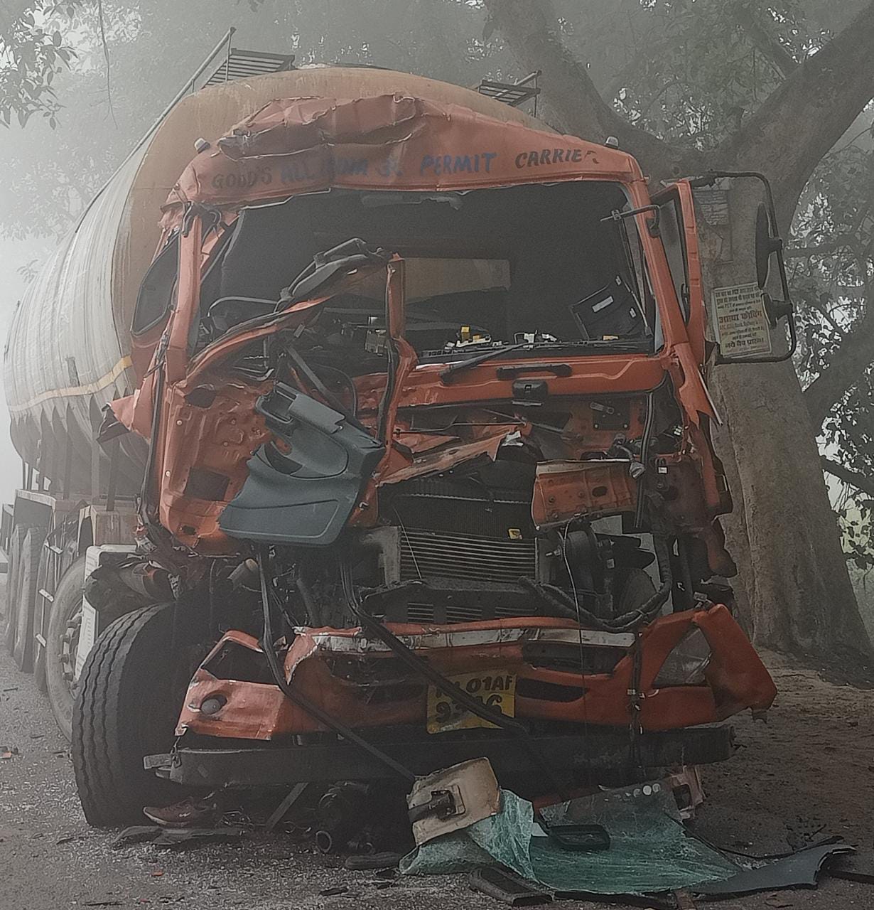 मल्लावां/हरदोई।घने कोहरे के चलते संडीला रोड पर चल रहे टैंकर ट्रक ने पीछे से दूसरे कंटेनर में टक्कर मार दी। जिससे पीछे चल रहे टैंकर के चालक की मौत हो गई। सूचना पर पहुंची पुलिस ने शव को पोस्टमार्टम के लिए हरदोई भेजा है।जनपद सीतापुर स्थित डालमिया सुगर मिल से दो टैंकर ऐथनाल भरकर गुजरात के जामनगर जा रहे थे। दोनों टैंकर आगे पीछे चल रहे थे। संडीला रोड पर गोसवा नगर पुल के पास सोमवार की रात करीब 11 बजे पीछे चल रहे टैंकर की कोहरे के चलते आगे चल रहे टैंकर से पीछे से टक्कर हो गई। जिससे पीछे चल रहे टैंकर चालक चैनाराम उम्र 27 पुत्र हीराराम निवासी करवारी जिला जैसलमेर राजस्थान की मौत केबिन में फंसकर मौत हो गई। जबकि आगे चल रहे कंटेंनर का चालक दोस्त मोहम्मद बाल बाल बच गया। सूचना पर पहुंची पुलिस ने किसी तरह शव को बाहर निकलवाकर कंटेंनर को सड़क से हटवाया। पुलिस ने मृतक के परिजनों को सूचना दी है। दूसरे कंटेंनर के चालक ने बताया कि तीन कंटेंनर एक साथ गुजरात जा रहे थे। कोहरे के चलते उसके कंटेंनर से हादसा हो गया। जबकि उससे आगे चल रहा कंटेंनर सुरक्षित बच गया। कोतवाल शेषनाथ सिंह ने बताया कि शव को पोस्टमार्टम के लिए हरदोई भेजा गया है। तहरीर मिलने पर कार्रवाई की जाएगी।