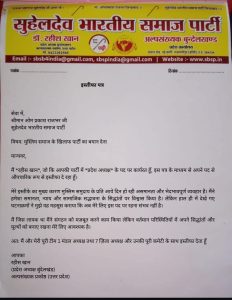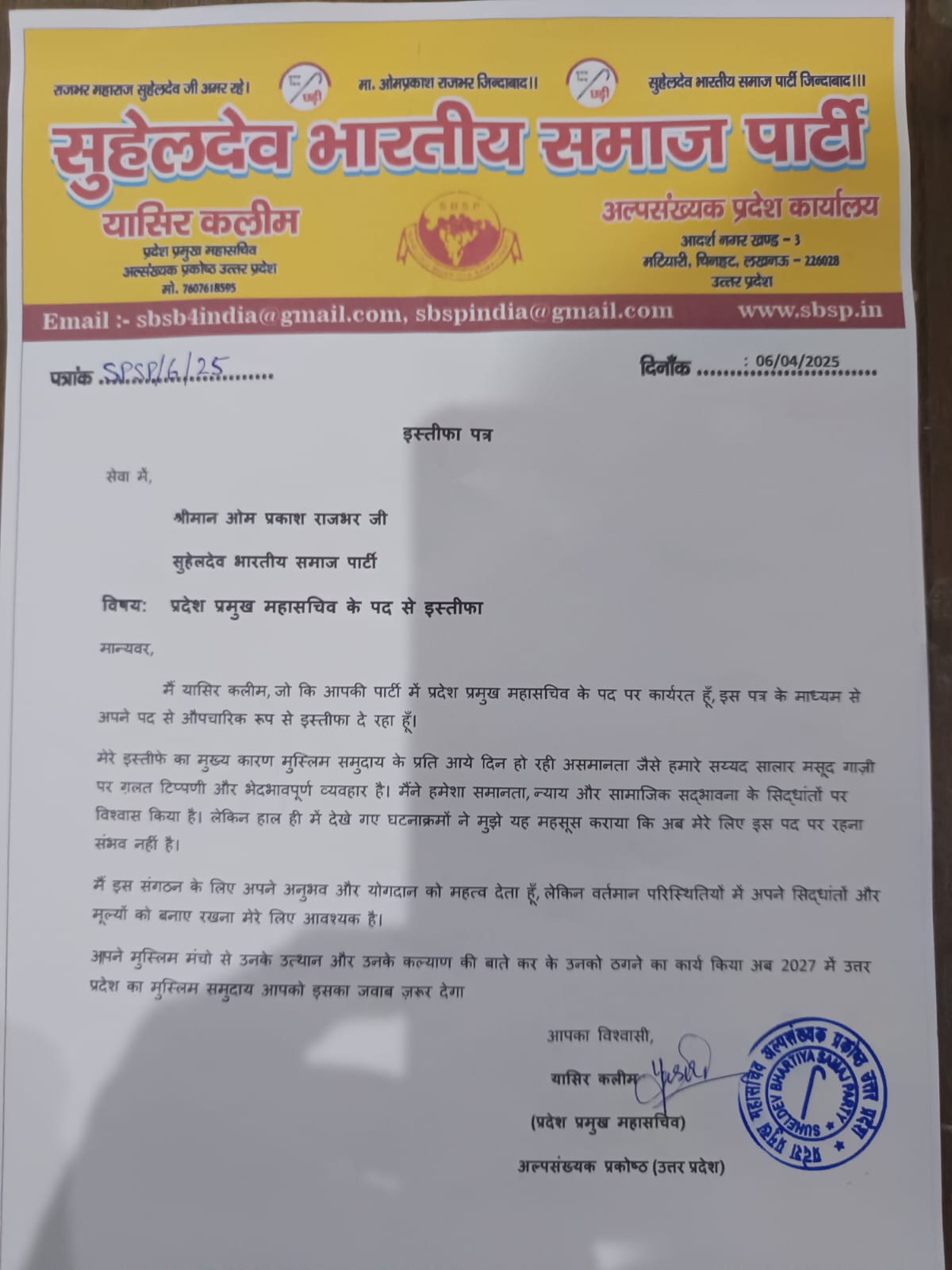 वक्फ़ संसोधन बिल को लेकर अब भारतीय सोहेलदेव पार्टी में लगी इस्तीफों की झड़ी