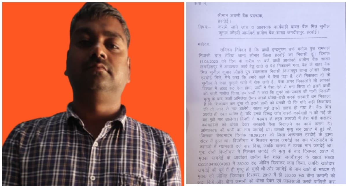 बावन(हरदोई)लोनार थाना क्षेत्र के निजामपुर गांव का सुनील जौहरी पुत्र श्यामलाल जौहरी आर्यवर्त ग्रामीण बैंक जगदीशपुर में बैंक मित्र था।अगस्त 2020 में तेरिया निवासी मनोज कठेरिया ने हरदोई की लीड बैंक के प्रबंधक से बैंकमित्र सुनील जौहरी पर धोखाधड़ी की शिकायत की थी ।शिकायत में कहा था कि निजामपुर निवासी महिला जगदेई पत्नी ओमप्रकाश की मृत्यु सितंबर 2017 में हो गयी थी जिसका पोस्टमार्टम भी हुआ था।बैंककर्मी सुनील ने महिला के पति ओमप्रकाश से मिलकर महिला की मृत्यु के तीन महीने बाद फर्जी कागज तैयार करके पहले महिला का नाम जगदेई से बदलकर ज्ञानवती कर दिया। और आर्यवर्त बैंक में ही महिला के नाम से 350 रुपये का वीमा कराया,बाद में फिर से महिला का फर्जी मृत्यु प्रमाणपत्र तैयार करके 2 लाख रुपये की वीमा क्लेम की राशि ओमप्रकाश के खाते में भेजवा दी। उसके बाद बीमा की राशि किश्तों में अपनी पत्नी रेखा तथा कुछ रिश्तेदार के खाते में ट्रांसफर करा दी।