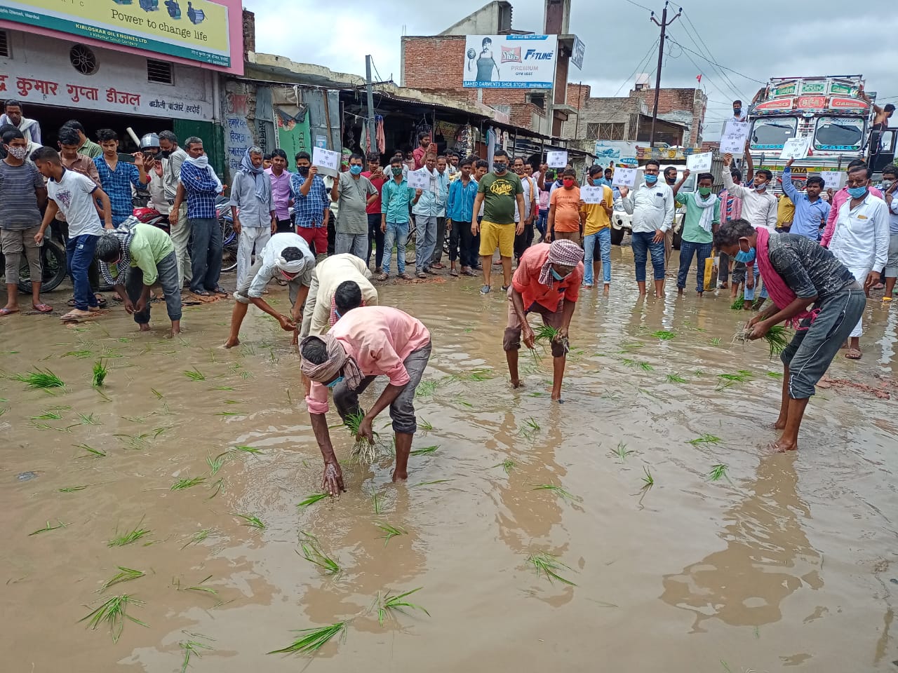 जलमग्न बघौली प्रतापनगर मार्ग पर व्यापारियों व ग्रामीणों ने लगाये धान की पौध