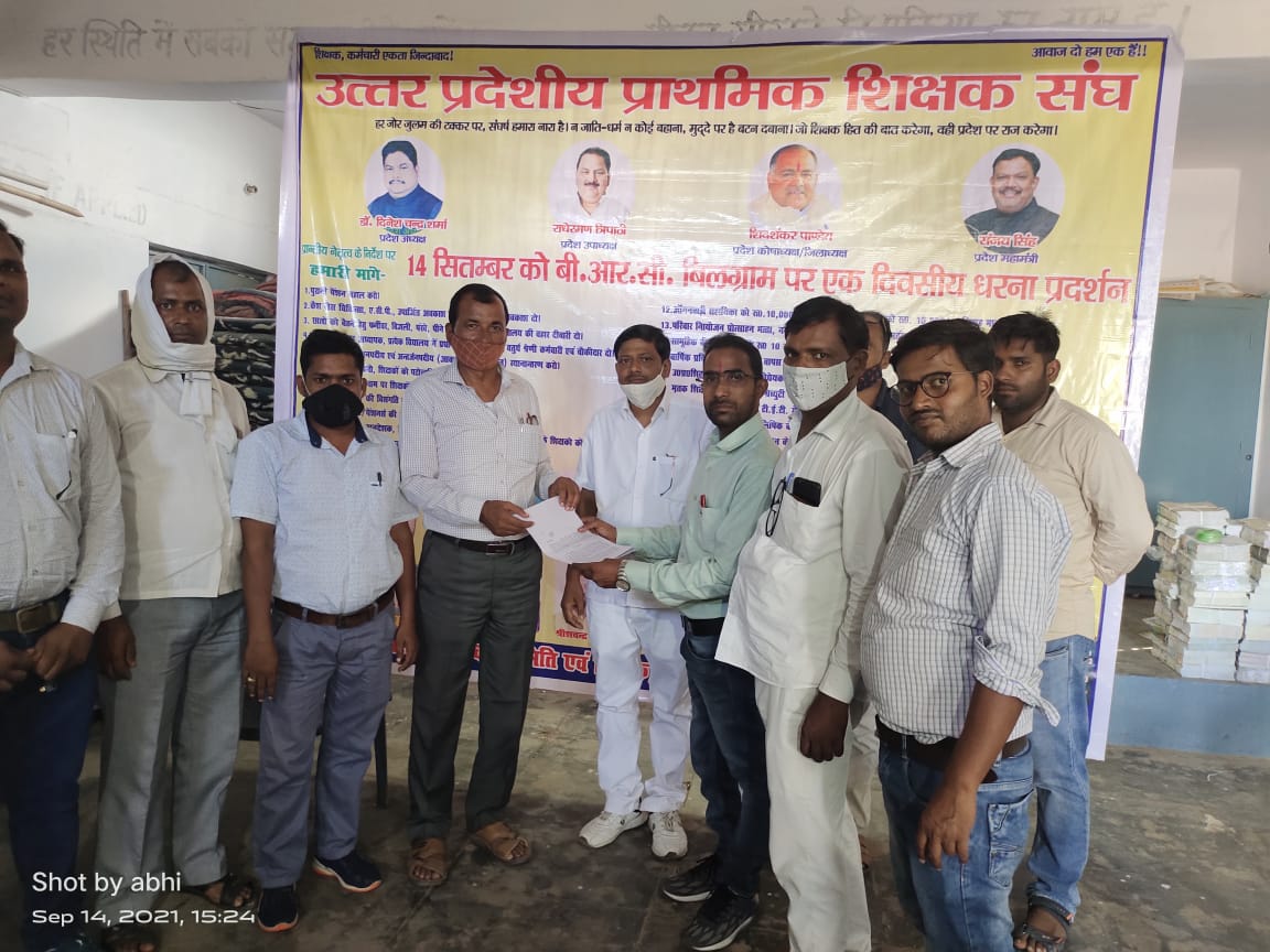 बिलग्राम/ हरदोई।उत्तर प्रदेशीय शिक्षक संघ के प्रांतीय नेतृत्व के आवाहन पर 21 सूत्रीय मांग पत्र के साथ ब्लॉक संसाधन केंद्र पर मुख्य सचिव उत्तर प्रदेश सरकार को संबोधित ज्ञापन देकर एक दिवसीय धरना दिया गया। जिसमें शिक्षकों की प्रमुख समस्याओ जैसे पुरानी पेंशन, कैशलेस चिकित्सा, वेतन विसंगति, शिक्षा मित्र व अनुदेशको के नियमितीकरण, सामूहिक बीमा,रसोइयों के मानदेय में बढ़ोत्तरी, आदि का निस्तारण करने के लिए सरकार से मांग की गई।