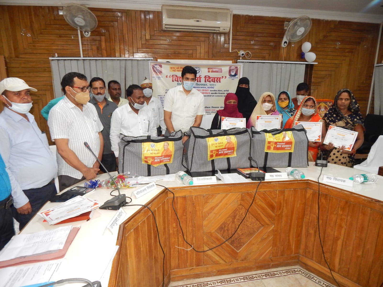 हरदोई।विश्वकर्मा दिवस पर विकास भवन के स्वर्ण जयंती सभागार में श्रम सम्मान योजना के अन्तर्गत आहूत कार्यक्रम का शुभारम्भ जिलाधिकारी अविनाश कुमार ने एक दर्जी की किट प्राप्त करने वाले धर्मवीर सिंह कुशवाहा से भगवान विश्वकर्मा के चित्र पर माल्यापर्ण कराकर किया। इसके बाद स्वयं भगवान विश्वकर्मा को पुष्प अर्पित कर प्रणाम किया। इसके उपरान्त जिलाधिकारी ने स्वयं का स्वरोजगार स्थापित करने वाले 15 लाभार्थियों को प्रधानमंत्री मुद्रा लोन के रू-27 लाख 50 हजार के प्रमाण पत्र तथा दर्जी, सोनार,कुम्हार,हथकरघा, एक जनपद एक उत्पाद आदि विधाओं में प्रशिक्षण प्राप्त लाभार्थियों को किट एवं प्रमाण पत्र प्रदान किये।
