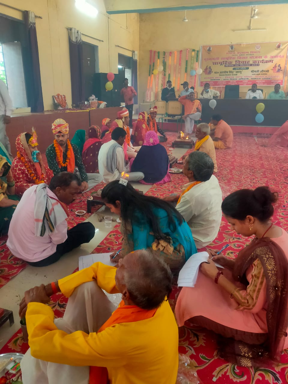 ब्लाक मुख्यालय पर आयोजित कार्यक्रम में बीडीओ नरोत्तम कुमार ने सभागार मंडप को गुब्बारों व आकर्षक रंग बिरंगे डिजाइन से सजाया।आचार्य ने सरोजनी, अंजली, सोनकली,नीता, रीता,प्रियांशु,शशि,रागिनी,पूजा व कंचन का विवाह हिन्दू रीतिरिवाज के अनुसार कराया।