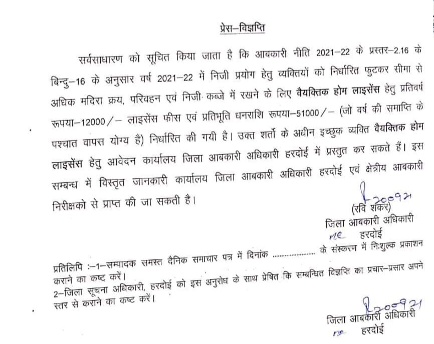 हरदोई।आबकारी विभाग ने मांगे आवदेन। होम लाइसेंस के प्रति वर्ष 12 हजार व प्रतिभूति राशि के 51 हजार जमा कर लाइसेंस दिया जाएगा। सरकार के निर्देश पर आबकारी विभाग ने जारी की विज्ञप्ति।