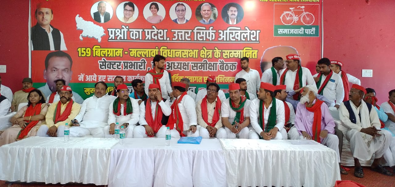 माधौगंज,हरदोई गोमती लान में समाजवादी पार्टी के विधानसभा अध्यक्ष नसीम अहमद ने बिलग्राम मल्लावां विधानसभा का बूथ सम्मेलन आयोजित किया बूथ सम्मेलन में विधानसभा अध्यक्ष नसीम अहमद व पार्टी के वरिष्ठ नेताओं पदाधिकारियों ने मुख्य अतिथि सपा जिलाध्यक्ष जितेंद्र वर्मा जीतू पटेल का 51 किलो की माला पहनाकर स्वागत किया सम्मेलन में मुख्य अतिथि समाजवादी पार्टी के जिलाध्यक्ष जितेंद्र वर्मा जीतू पटेल ने सेक्टर प्रभारी व बूथ अध्यक्षों की हाजिरी ली बूथ सम्मेलन को संबोधित करते हुए कहा कि बूथ अध्यक्ष नए वोट बनवाने में तेजी से कार्य करें उन्होंने कहा कि बूथ अध्यक्ष सपा सरकार में हुए विकास कामों के प्रचार के लिए गांव घर घर दौरा करें उन्होंने कहा बूथ की मजबूती ही चुनाव में जीत का आधार है उन्होंने कहा कि सपा सरकार में अखिलेश यादव ने हर जिले में 100 बेड का महिला अस्पताल, जी जी आई सी इंटर कॉलेज , ट्रामा सेण्टर, किसान बाजार, किसान मंडी, कृषि महा विद्यालय की सुविधा दी साथ ही लखनऊ में सहित सभी जिलों में फोर लेन, व लखनऊ में मेट्रो,स्टेडियम , हाई कोर्ट, पुलिस मुख्यालय , 100 नम्बर पुलिस ,1090 महिला सुरक्षा, लैपटॉप, महिला पेंशन 5 लाख 43 हजार सरकारी नौकरी सहित हजारों विकास कार्य कराए थे अब जनता सपा के किए विकास कामों के आधार पर सपा की बहुमत में सरकार बनायेगी बीजेपी सरकार ने कोई विकास कार्य नहीं किए बीजेपी सरकार में किसान, नौजवान, महिला, व्यापारी , मजदूर सहित सभी परेशान है इसलिए 2022 के चुनाव में जनता सपा के प्रत्याशियों को जितायेगी व बीजेपी के प्रत्याशियों की जमानत जब्त करा देगी सम्मेलन में प्रमुख रूप से प्रभारी जिला कोषाध्यक्ष अतुल उपाध्यक्ष, पूर्व अध्यक्ष पदमराग सिंह यादव, ब्रजेश वर्मा टिल्लू, मीना वर्मा अश्वनी पटेल एडवोकेट,विवेक पटेल जिला उपाध्यक्ष रहमत अली मोनू, जिला उपाध्यक्ष अमित सिंह मोनू नगर अध्यक्ष रियायत खां महिला सभा अध्यक्ष गीता सिंह सैनिक प्रकोष्ठ अध्यक्ष सूर्य प्रकाश त्रिवेदी, मनीष वर्मा जिला सचिव बुद्धि प्रकाश पटेल, महेंद्र पटेल,हरीनाम यादव राजीव पटेल, कपिल सिंह, सईद अहमद अभिनव बदरुद्दीन अंसारी, मो फुरकान, राजपूत,अफसर अली, अजबू यादव, विमल पटेल अनुराग पटेल, सुशांत पाल , शिव यादव , कुलदीप यादव तंमय पटेल सहित सेक्टर प्रभारी व बूथ अध्यक्ष मौजूद रहे