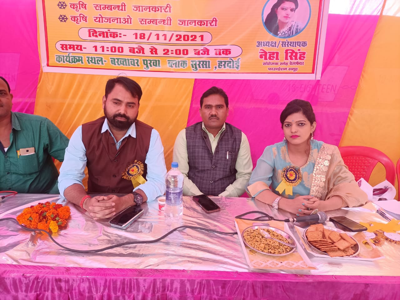 इसी कार्यक्रम की संस्थापक अध्यक्ष नेहा सिंह ने कटाई उपरांत खर्च वाहन अल्प अवधि में फसली ऋण आवश्यकता कृषि ऋण किसान क्रेडिट कार्ड फसल बीमा योजना संबंधी जानकारी दी कार्यक्रम में कृषि निदेशक नंद किशोर भी अतिथि के रूप में आए और उन्होंने भी महत्वपूर्ण जानकारियों से किसान भाइयों को अवगत कराया। कृषक दुर्घटना बीमा योजना कृषि ऋण समय भारत सरकार द्वारा ब्याज दरों में कटौती व लाभ की भी जानकारी दी।कार्यक्रम में प्रेमचंद कुशवाहा,जनपद सलाहकार राष्ट्रीय खाद्य सुरक्षा मिशन हरदोई ने भी जानकारियां फसल बीमा योजना संबंधित जानकारियां दी। कार्यक्रम में नेहा ने किसान सम्मान समारोह के अंतर्गत गरीब निर्धन किसानों को कंबल वितरण भी किए एवं उनका सम्मान किया गया।