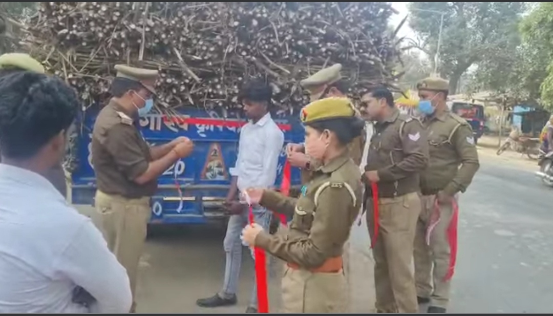 पिहानी पुलिस का सराहनीय कदम, गन्ने लदे ट्रैक्टर ट्राली ओं पर पुलिस ने लगवाया निशुल्क रिफ्लेक्टर