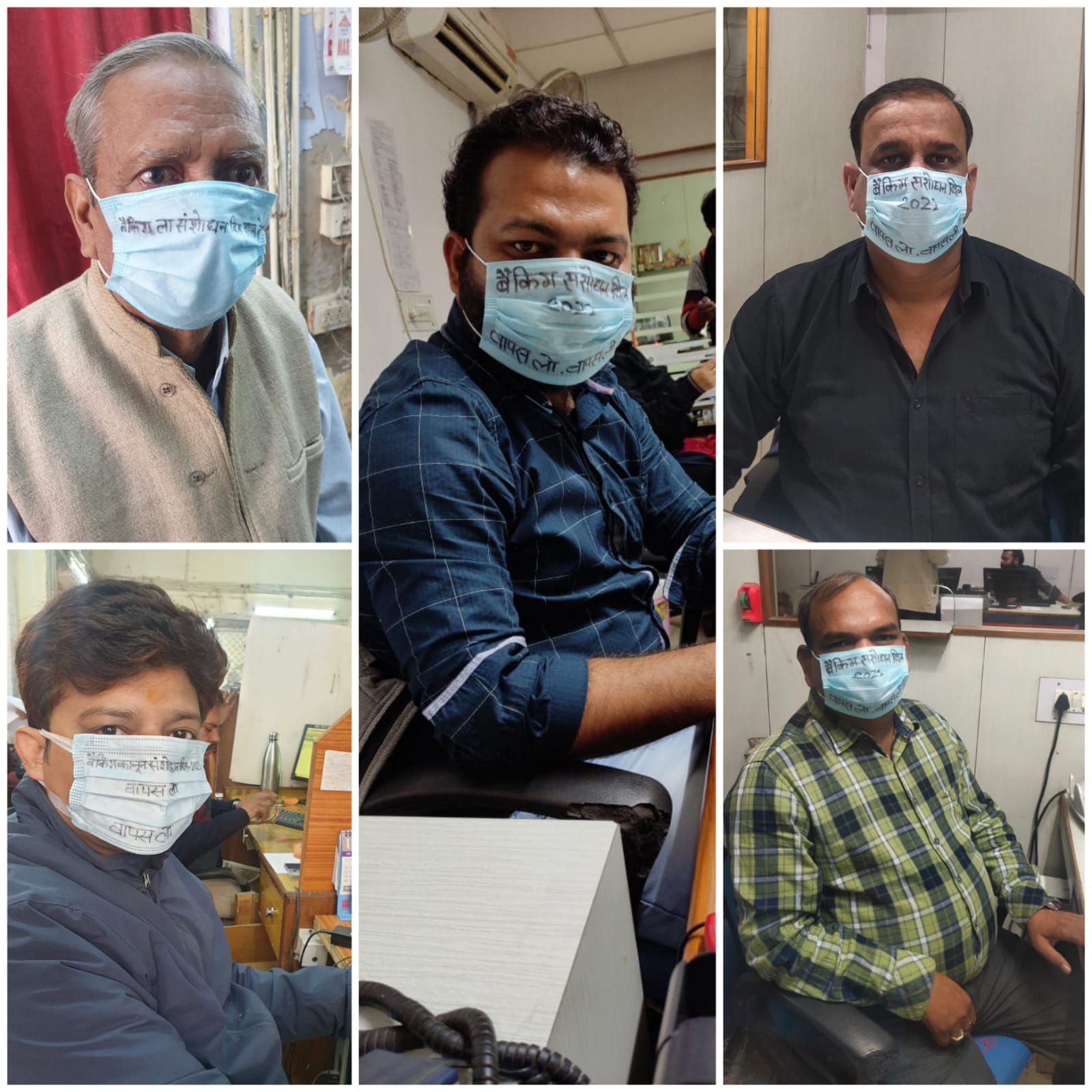 हरदोई।बैंकिंग कानून संशोधन बिल 2021 वापस लेने की माँग कर रहे बैंककर्मियों ने प्रोटेस्ट मास्क लगाए। 16 व 17 दिसम्बर को दो दिन की राष्ट्रव्यापी बैंक हड़ताल पर बैंक अधिकारी कर्मचारी जा रहे हैं।