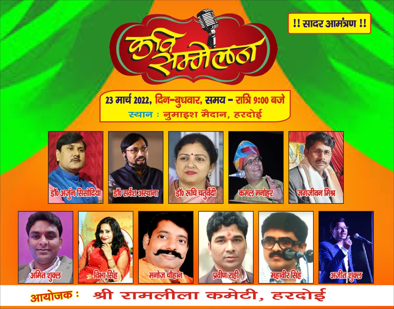 हरदोई।श्री राम लीला कमेटी हरदोई द्वारा शहर के नुमाईश मैदान दिनांक 23 मार्च दिन बुधवार को रात्रि 9 बजे से अखिल भारतीय कवि सम्मेलन का आयोजन किया जायेगा, जिसमें राष्ट्रीय एवं अंतर्राष्ट्रीय ख्याति प्राप्त कवि प्रतिभाग करेंगे।